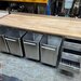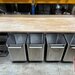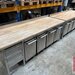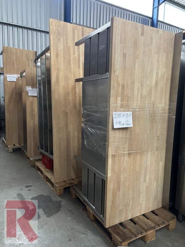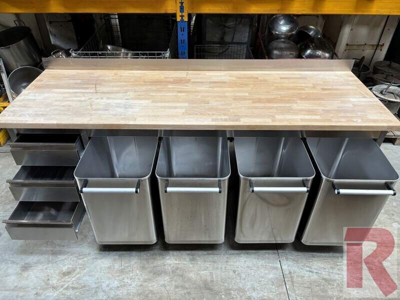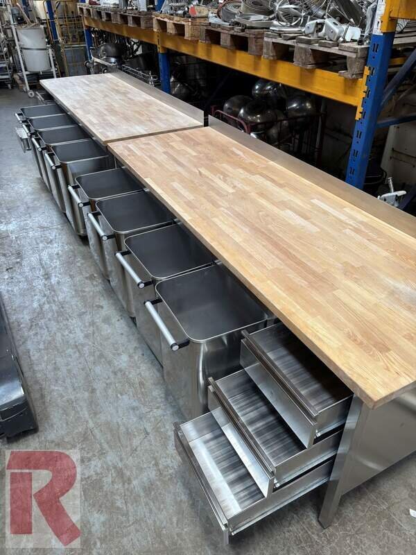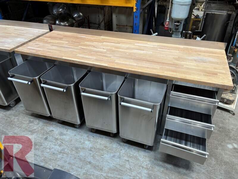 Work table with beech wood top, approx. 80 x 250 cm, (2 pieces) one incl. drawer unit on the left, the other with drawer unit on the right, both incl. 4 flour trolleys each for approx. 100 kg flour or similar made of stainless steel, in good condition (see also photos). Working height: approx. 90 to 95 cm (can be adjusted via plastic feet) - New price: 3,390.00 net (per piece). Weight incl. trolleys: approx. 200 kg per set.