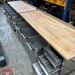 Arbeitstisch mit Buchenholzplatte, ca. 80 x 250 cm, (2 Stück) einer davon inkl. Schubladenblock links, der andere mit Schubladenblock rechts, beide inkl. je 4 Mehlwagen für je ca. 100 kg Mehl oder ähnliches aus Edelstahl, im gepflegten Zustand (siehe auch Fotos). Arbeitshöhe: ca. 90 bis 95 cm (kann über Kunststofffüße eingestellt werden) - Neupreis: 3.390,- netto (pro Stück). Gewicht inkl. der Wagen: ca. 200 kg pro Set.