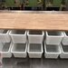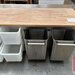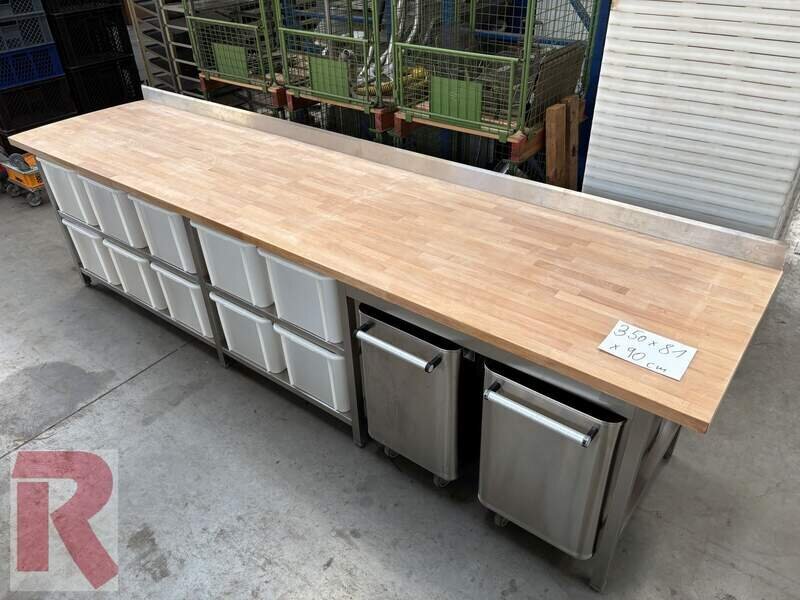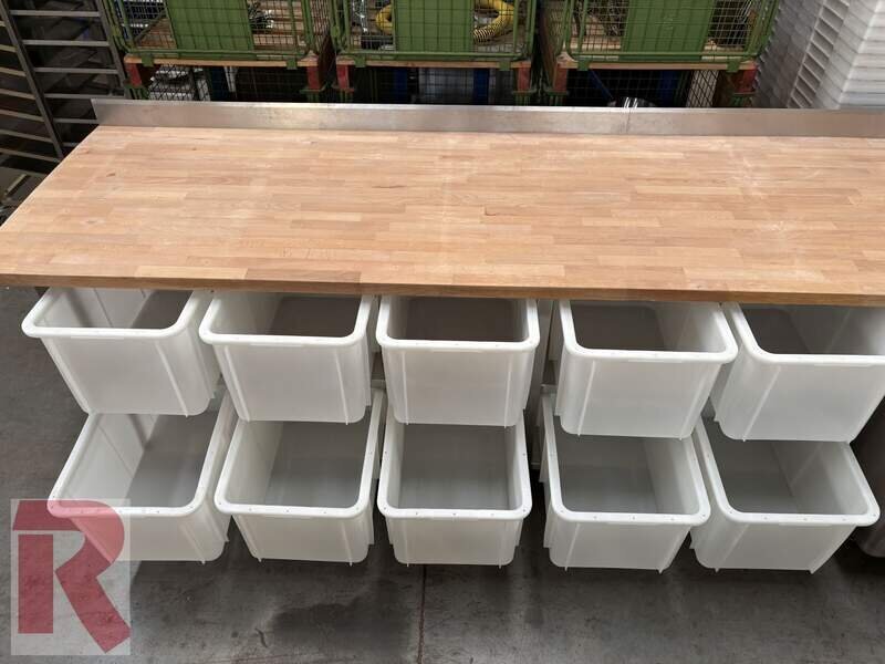 Arbeitstisch mit Buchenholzplatte, ca. 80 x 350 cm, (mehrere Varianten verfügbar), zum Beispiel mit 10 Kunststoff-Zutatenbehältern und 2 Mehlwagen für je ca. 100 kg Mehl oder ähnliches aus Edelstahl, im gepflegten Zustand (siehe auch Fotos). Arbeitshöhe: ca. 90 cm (kann über Kunststofffüße eingestellt werden) - Neupreis: 3.190,- netto. Gewicht inkl. der Wagen: ca. 200 kg