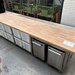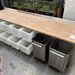 Bakery work table / bench with beech wood top, approx. 80 x 350 cm, (several variants available), for example with 10 plastic ingredient containers and 2 flour trolleys for approx. 100 kg of flour each or similar made of stainless steel, in good condition (see also photos). Working height: approx. 90 cm (can be adjusted using plastic feet) - Original price: € 3,190 net. Weight including trolleys: approx. 200 kg