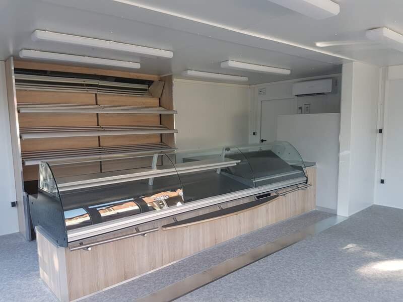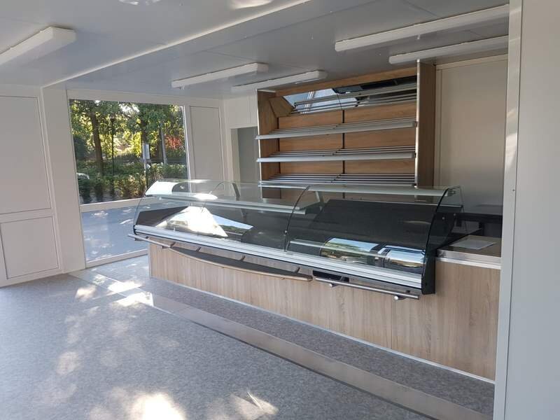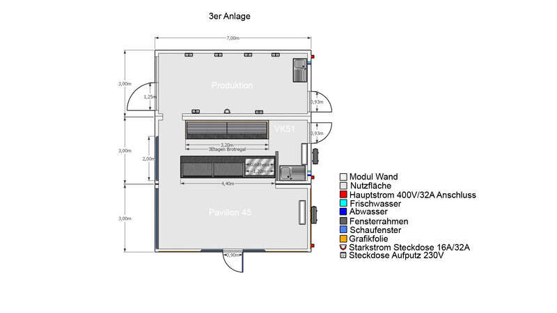 Backwaren-Verkaufscontainer 3er Anlage (7x9m) mit Backwaren-Ladeneinrichtung