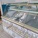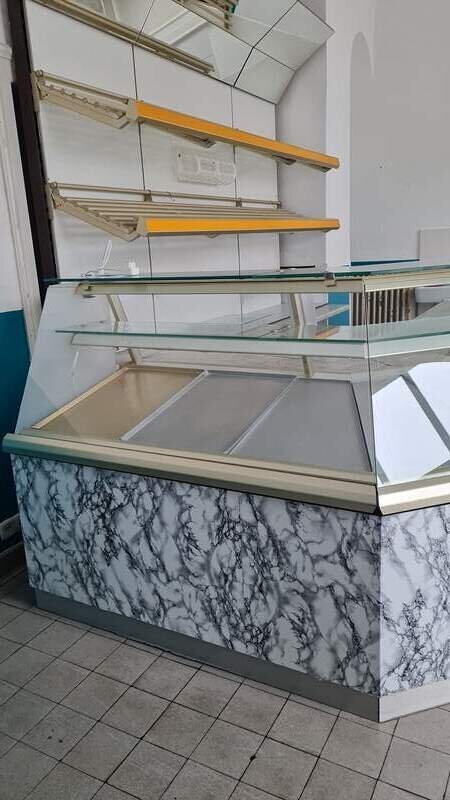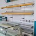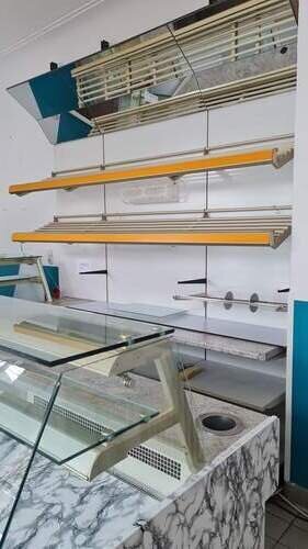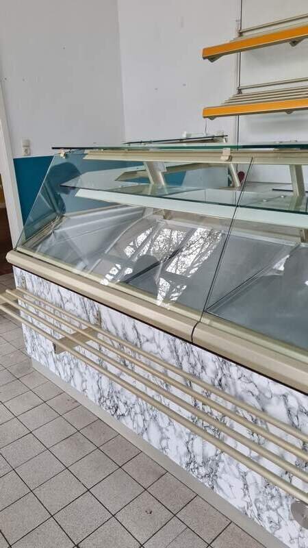 Gebrauchte Bäckereitheke mit Glasauslage und Brotregal im charmanten Retrolook
