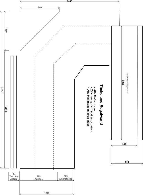 Die derzeitige Höhe ist durch die Haltestange mit ca. 290cm gegeben. Die Stangen können auch gekürzt werden. Das Brotauslageregal ist ca. 220cm hoch, der Spiegel darüber ist 35cm hoch und kann auch tiefer gesetzt werden.