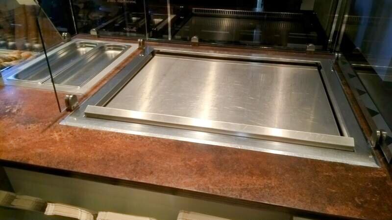 Gebrauchte Verkaufstheke mit Kühlung und heißer Theke, B 1,44 m; T 1,40 m; H 0,88 m; H mit Glas 1,6 m; Edelstahl-Behälter mit Deckel für Wasserbad, gepflegter Zustand