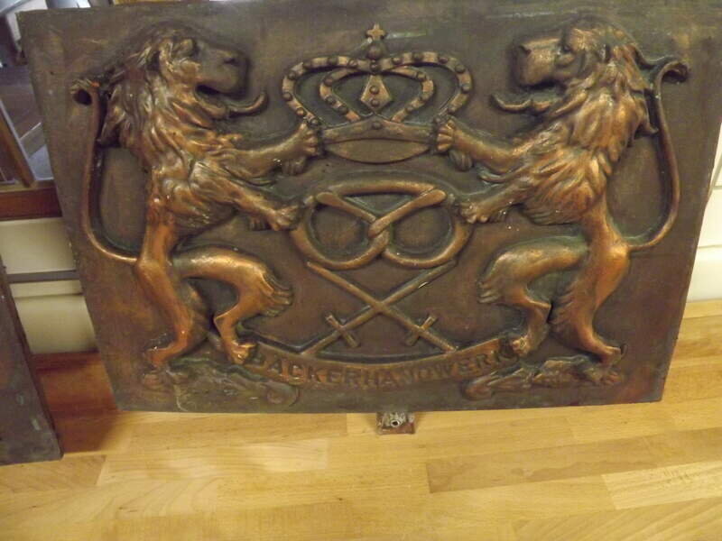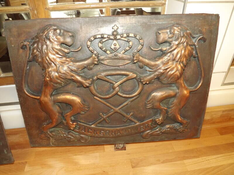 2 wunderschöne Backerwappen - Reliefs aus Kupfer / Handgearbeitet Ende der 1960 iger Jahre , guter Zuustand ! Beide Reliefs waren früher an der Fassade meines Lehrbetriebes angebracht . Beide sind absolute Unikate und für das Anbringen im Aussenbereich geeignet.