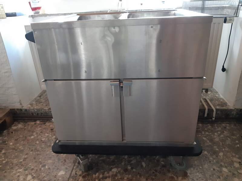 Verkaufen aus dem gastronomischen Gebrauchtwarenhandel zwei gebrauchte, funktionstüchtige Speisentransportwagen der Produktion RIEBER mit zwei Becken 1/1 GN und Wärmeschrank für 1 GN Einschübe. Der aus Edelstahl bestehende Wagen hat die Abmessung von 750mmx610mmx900mm, läuft auf 4 beweglichen Rollen mit Feststellung, jede Heizeinheit ist separat einschaltbar. Es sind zwei gleiche Geräte vorhanden, angegebener Preis versteht sich für das einzelne Gerät.