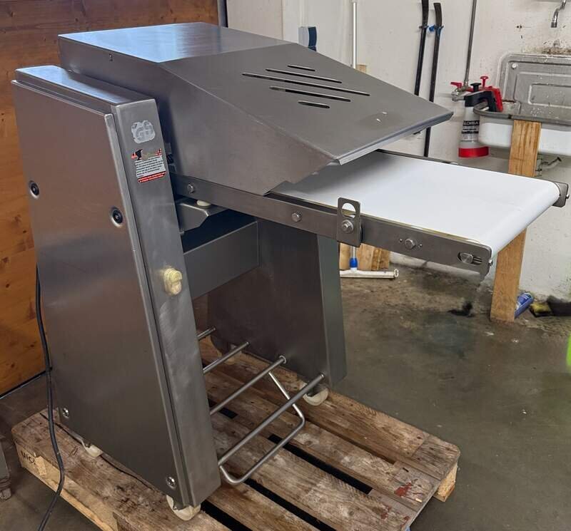 Abschwartmaschine, Bandentschwarter Maja Skinny, mit neuem Zuführband, Tisch zur offenen Verwendung, Anschluss 400V, Maße LxBxH ca. 95x85x120cm, Gewicht ca. 200kg, Baujahr 2002, Die Maschine ist in sehr gutem Zustand, läuft ruhig.