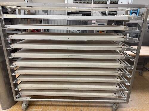 1 Stück, Transportwagen Edelstahl für Tuchabziehapparate 1600mm x 580mm, Außenmass 2110mm x 650mm x 1860mm, 10 Etagen mit extra verstärkten 2,5mm Auflagen, massive Bauweise ausgerüstet mit 4 stabilen Lenkrollen gummiert (160mm), 10 Abzieher