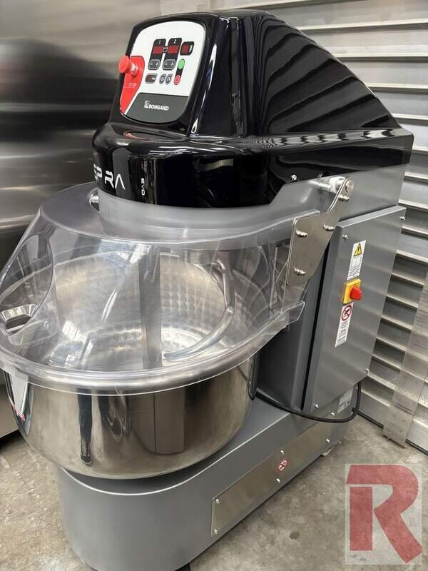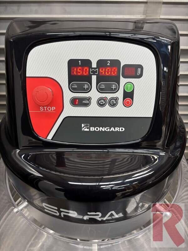 Spiral mixer with fixed bowl, type "Spiral EvO 110 E Lid" for up to approx. 80 kg dough or 50 kg flour, year of manufacture 09-2021 in very good condition, technically and visually almost as new, hardly used, for kneading all types of dough, optimum kneading with low heating, incl. electronic control for 1st and 2nd speed, counter-rotation of the bowl possible for better mixing of the ingredients, incl. plastic bowl cover, kneading times can also be stored in 8 programmes, e.g. for different doughs. Also optimised for working with the Bongard Paneotrad dough divider.