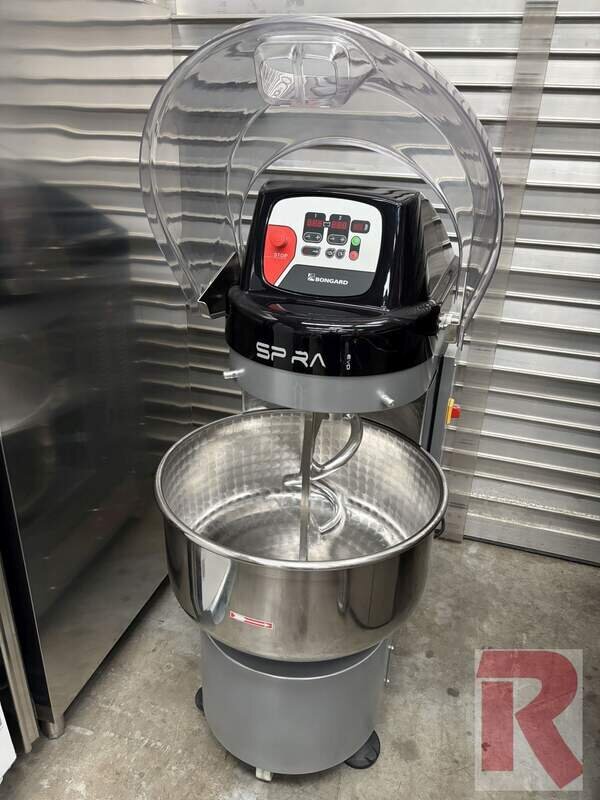 Spiral mixer with fixed bowl, type "Spiral EvO 110 E Lid" for up to approx. 80 kg dough or 50 kg flour, year of manufacture 09-2021 in very good condition, technically and visually almost as new, hardly used, for kneading all types of dough, optimum kneading with low heating, incl. electronic control for 1st and 2nd speed, counter-rotation of the bowl possible for better mixing of the ingredients, incl. plastic bowl cover, kneading times can also be stored in 8 programmes, e.g. for different doughs. Also optimised for working with the Bongard Paneotrad dough divider.