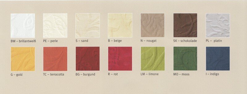 Bügelfreie Tischwäsche aus 70% Baumwolle, 30% Polyester, ca. 250-260 g/qm, Einlauf ca. 3%, pflegeleicht ausgerüstet, hochveredelt, 60° Wäsche, schmal gesäumt, trendige Farben