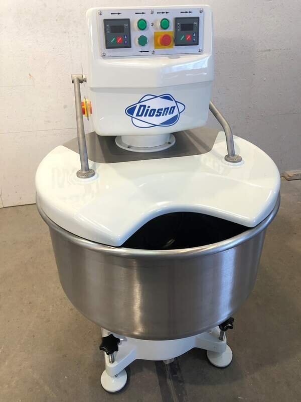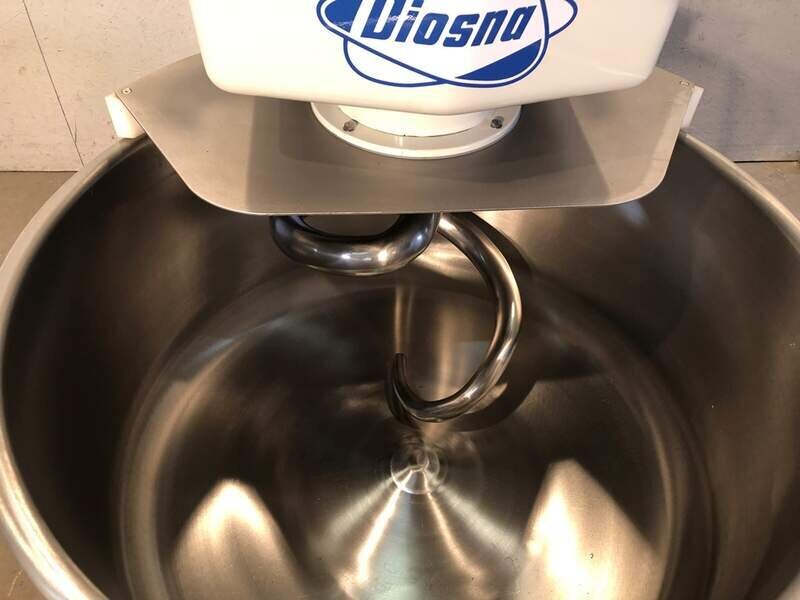 gebrauchter, überholter Diosna Spiralkneter SP 120 D (für max. 120kg Teig / 75kg Mehl). Die Maschine hat einen Edelstahlkessel, eine Edelstahlspirale, ist fahrbar, hat 2 Geschwindigkeiten.