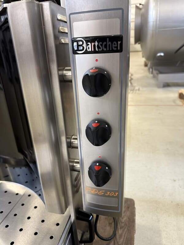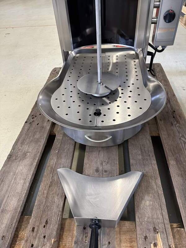 Wir verkaufen hier einen Dönergrill/Gyrosgrill vom Hersteller Bartscher, Typ PDE303 in einem sehr guten gebrauchten Zustand. Gerät läuft auf 400 Volt, 5,5 kW, Elektro mit Ceran-Glas, Spießhöhe 47 cm, Fleischspieß Kapazität 45-60 kg, nur zu Testzwecken genutzt, Werkstatt geprüft, sofort einsatzbereit, Maße B/T/H 60/70/80 cm, weiteres auf Anfrage.