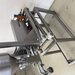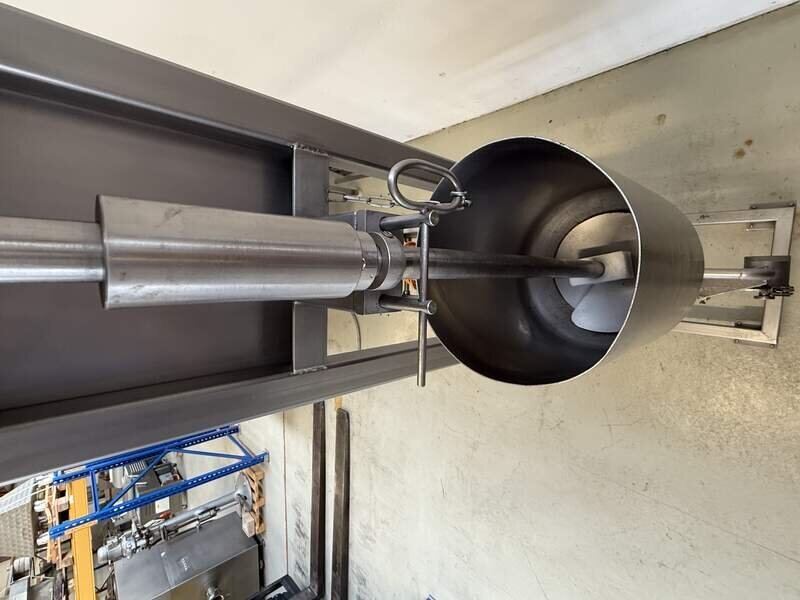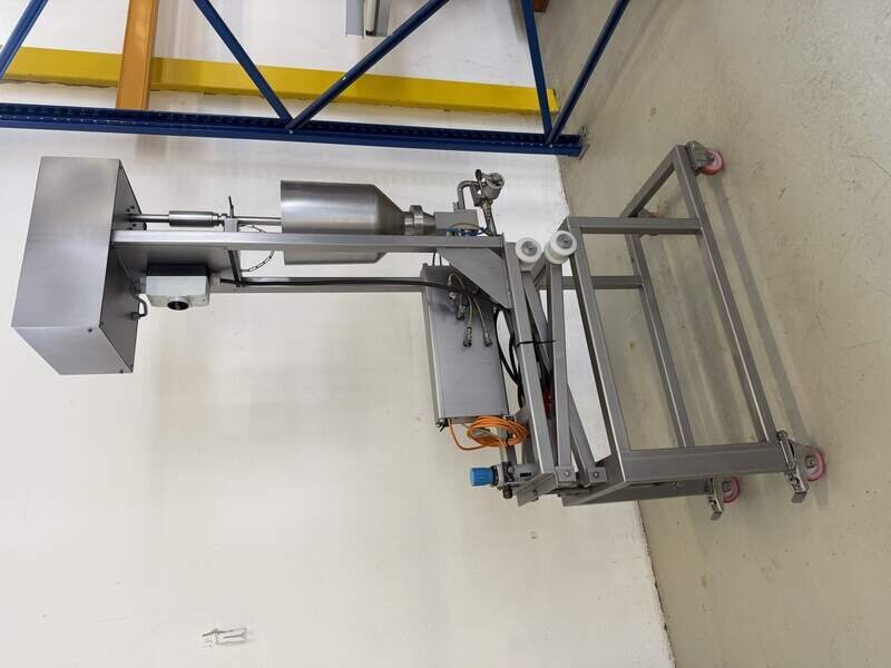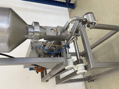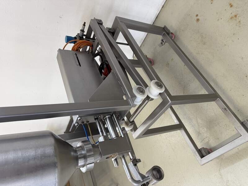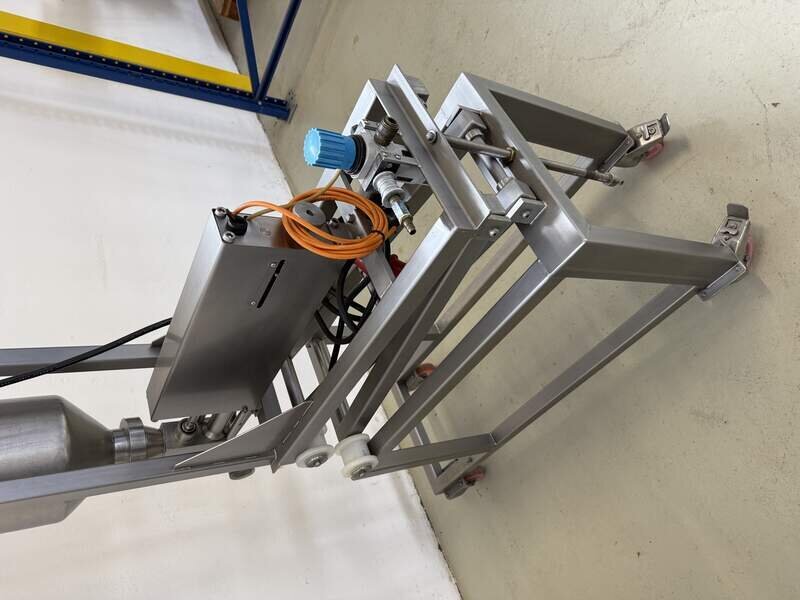 Hersteller und Typ unbekannt, komplett Edelstahl, Pneumatisch betrieben, Trichter ca. 12 Liter, B/T/H 40/110/200 cm.
