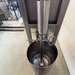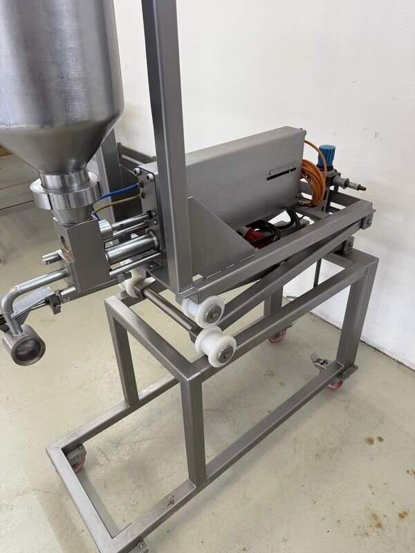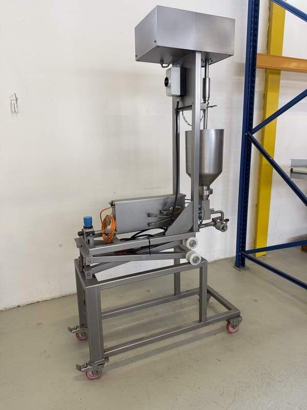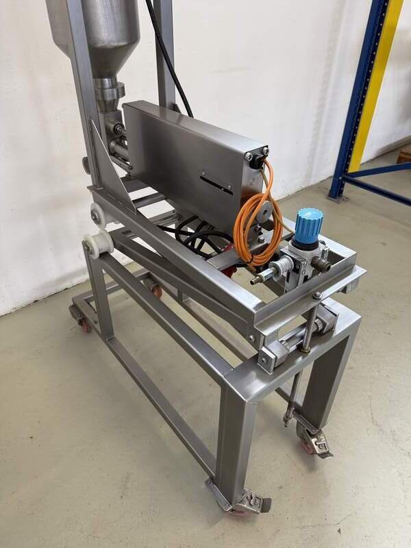 Hersteller und Typ unbekannt, komplett Edelstahl, Pneumatisch betrieben, Trichter ca. 12 Liter, B/T/H 40/110/200 cm.