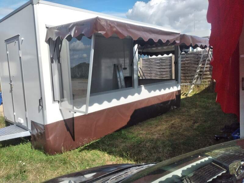 Zusätzlich geben wir auch einen originallen Event Verkaufsanhänger ab -welcher rundherum zu öffnen ist Verkaufsraumlänge 6 m Meter - steht noch auf dem Eventgelände in Wacken - grade vier neue rote Eckplanen erhalten - mit oder ohne Gerätschaften.