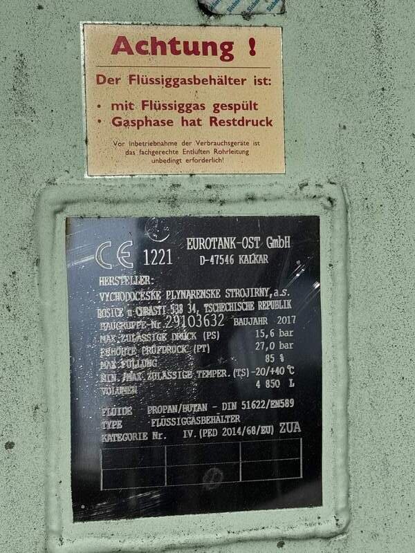 Zum Verkauf steht ein gebrauchter Flüssiggas-Drucktank der EUROTANK-OST GmbH mit einem Fassungsvermögen von 4.850 Litern. Der Behälter wurde im Jahr 2017 hergestellt und befindet sich in einem guten Zustand.