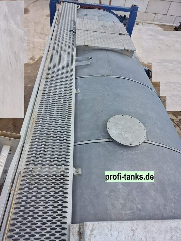 Gebrauchter V4A Edelstahltank 28,5 m³ / 28.500 L in gutem Zustand. Liegender Lagertank, Containertank, isoliert mit ca. 20 cm Glaswolle / Hartschaum, beheizbar o. kühlbar. Umklappbares Geländer, 2 x Dom oben auf dem Dach, mehrere Zu- und Ausläufe.