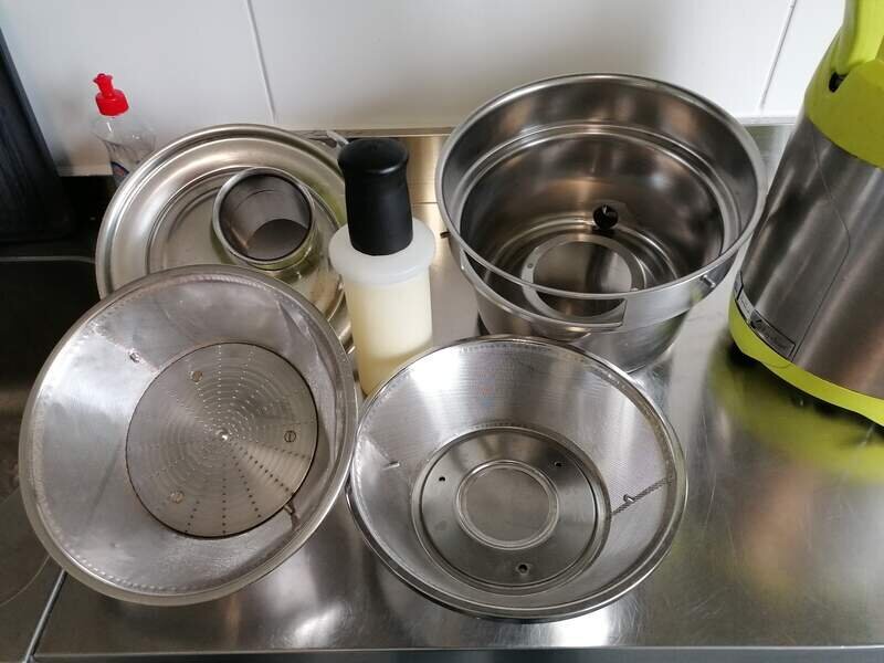 Gebrauchter Santos Entsafter, Baujahr 2018, max. 140L/h zu verkaufen. Ein zweiter Siebeinsatz ist dabei. Der Tresterbehälter FEHLT.