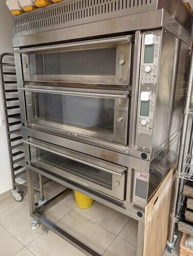 Sehr gut erhaltener Manz Herdbackofen mit 3 Etagen je 80x60 cm. Wie man sehen kann, wurde der Ofen mit einer Backetage erweitert, die bereits ein neues modernes Steuerungsmodul hat.