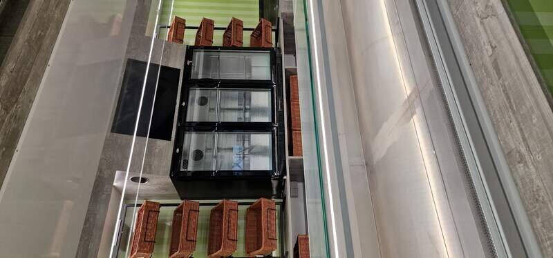 FCKW-freies System mit Thermostatregelung, Kältemaschine mit Wärmetauscher in zwangsbelüftetem Einbaukasten eingebaut. Alle Kühlanlagen sind für eine Temperatur von ca. plus 7 Grad C bei einer Umgebungstemperatur von plus 30 Grad C ausgelegt.