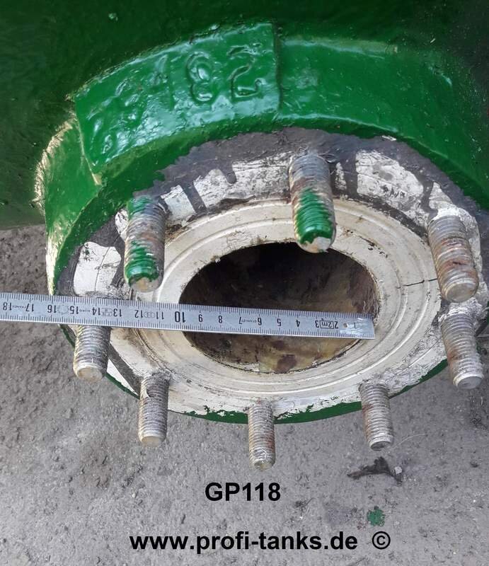 Horizontal liegender, runder, oberirdischer Lagertank auf fünf Stahlsockeln oder auf einem Stahlsockelgestell. Dom oben auf dem Tankkörper, unten an der Stirnseite ein DN100-Auslauf, mehrere Zu- und Ausläufe. Tank wurde von uns neu gestrichen, derzeit noch 2 Stück auf Lager.