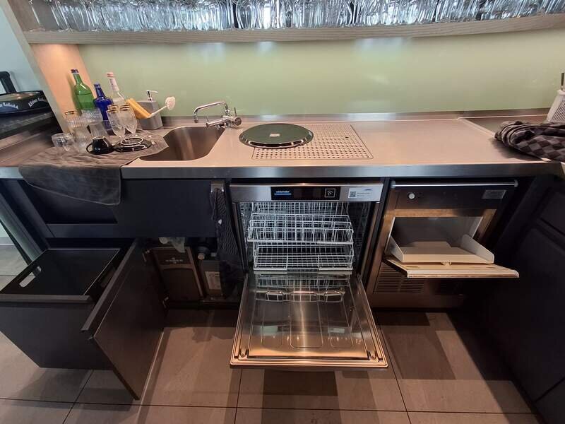 Küche mit Abzug und allen E-Geräten, Marmor/Metall-Bar, hochwertige Innen- Außenbestuhlung Weinkühlschränke, Massivholz Tisch