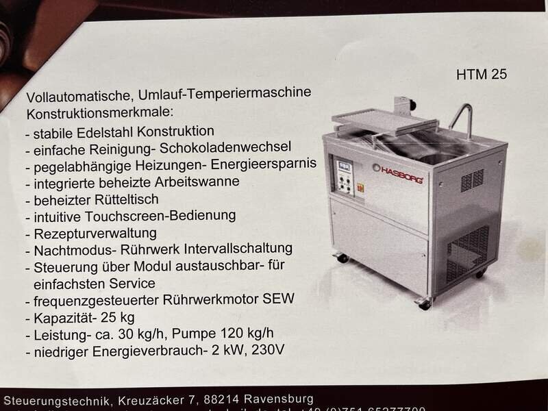 Zum verkauf steht eine professionelle, kaum benutzte Umlauf-Temperiermaschine der Firma Hasborg (LCM). Sie stammt aus dem Jahr 2023 und hatte max. 100kg Schokolade im System. Sie ist wie NEU!
