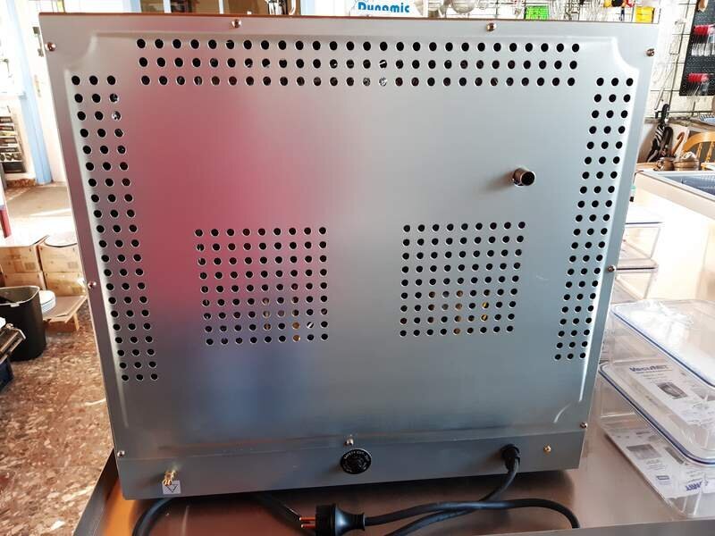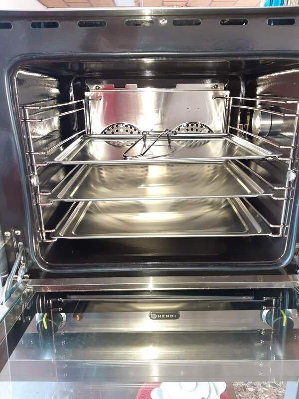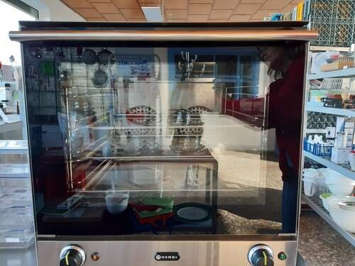 Verkaufen aus der Ausstellung einen Heißluftofen (Konvektorofen H90) der Marke HENDI aus Edelstahl für einen Indor-Betrieb. Mit einem Anschlußwert von 240V-50/60Hz u. einer regelbaren Temperatur von 50°C bis 350°C lässt er für das professionelle backen und garen keine Wünsche offen. Die Abmessungen des freistehenden Gerätes betragen B559xT559xH570mm.