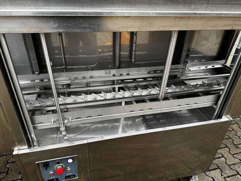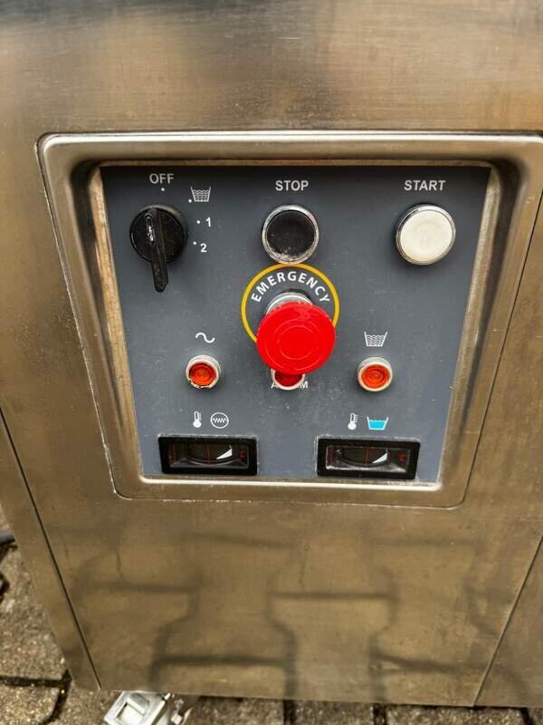 Es ist eine gebrauchte Hochstetter Durchschubspülmaschine Typ BX230 DX/EL für Körbe zu verkaufen. Die Maschine schafft bis zu 230 Körbe.