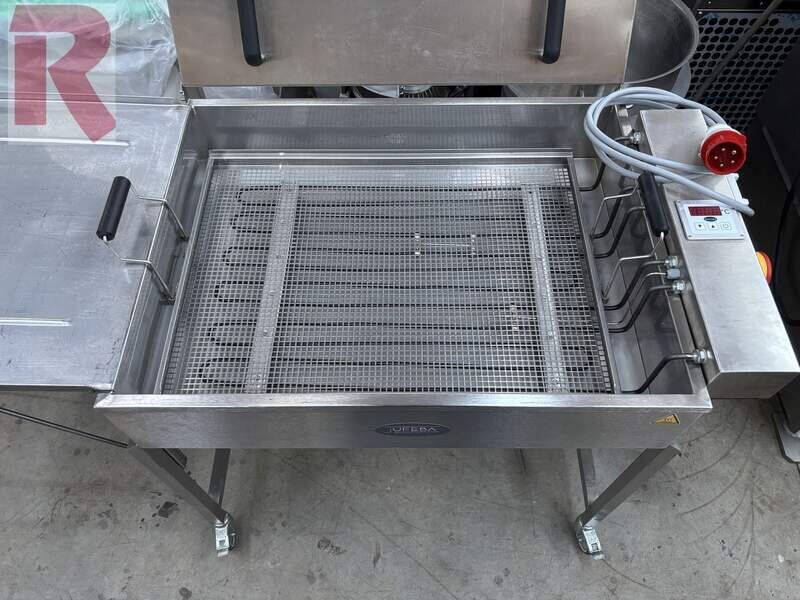 Jufeba TK-S 10 manuelles Fettbackgerät, BJ 2023, nahezu neuwertig, für bis zu ca. 48 Teiglinge mit fahrbarem Untergestell inkl. ausklappbarem Abtropfstand, komplett aus Edelstahl gefertigt, inkl. Dampfdeckel, 2 Alu-Tauchkörben und einem elektronischen Temperaturregler. Elektrischer Anschluss: 380 bzw. 400 V, 3 Phasen, ca. 7,5 kW - Bis zu ca. 480 Gebäcke pro Stunde möglich.