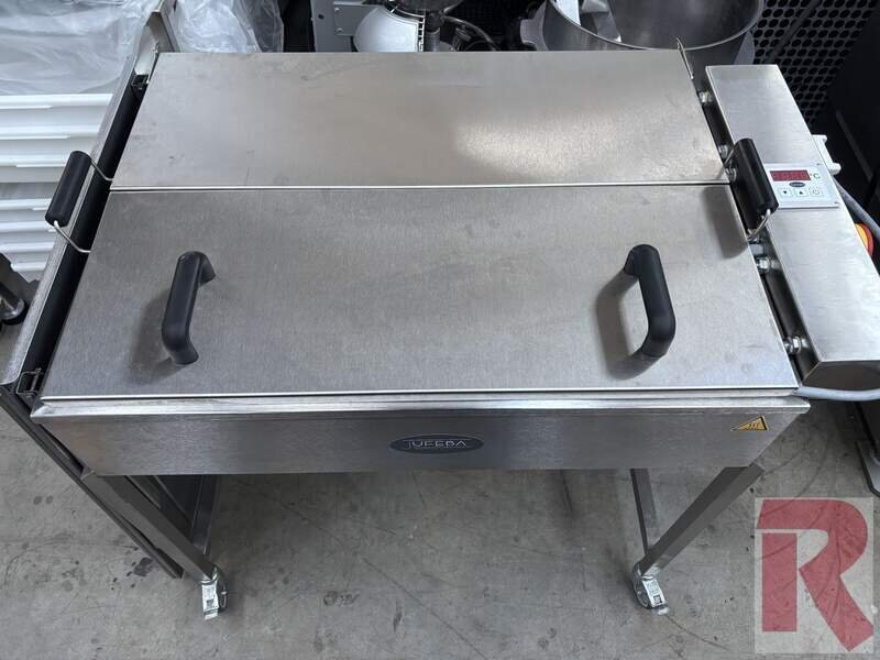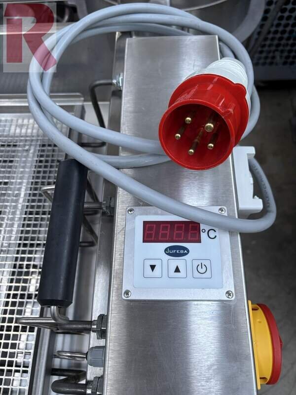 Jufeba TK-S 10 manual deep fryer, built in 2023, almost as good as new, for up to approx. 48 dough pieces with mobile base frame including fold-out drip tray, made entirely of stainless steel, including steam lid, 2 aluminium immersion baskets and an electronic temperature controller. Electrical connection: 380 or 400 V, 3 phases, approx. 7.5 kW - Up to approx. 480 baked goods (donuts and so on) per hour possible.