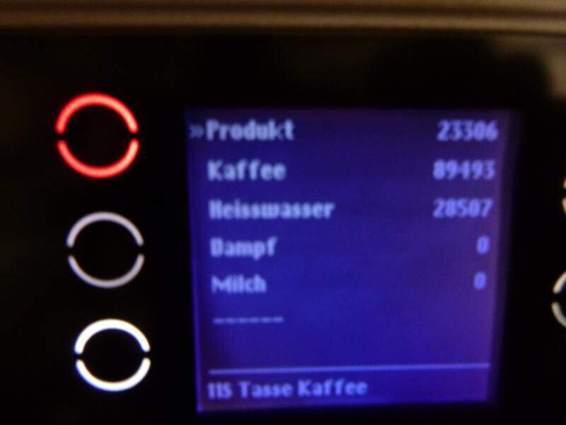 Angabe lt. Display: Produkt 23306, Kaffee 89493, Heisswasser 28507, Dampf+Milch 0Stk.