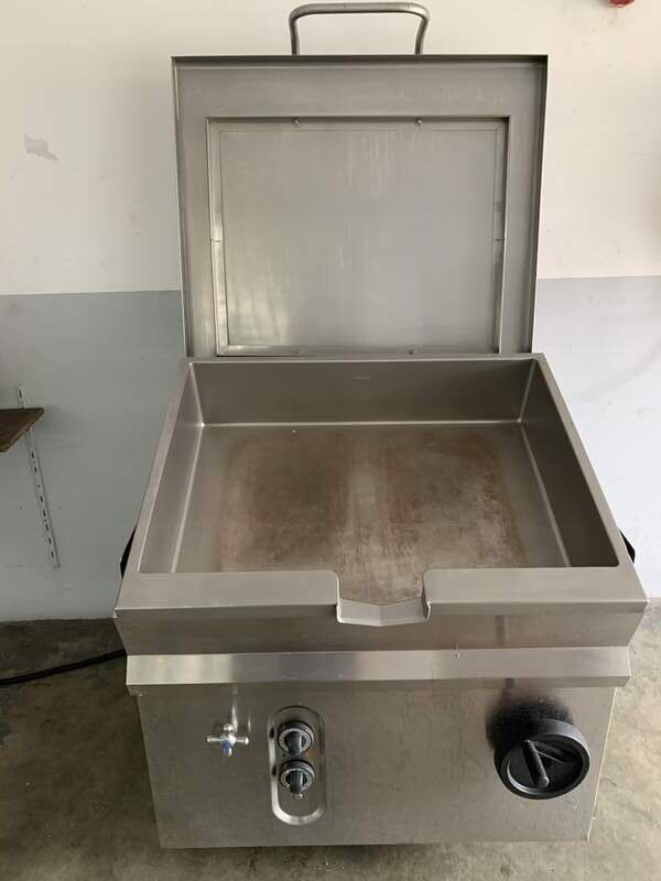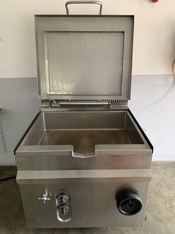 Kippbratpfanne aus Edelstahl ist auch hervorragend für Eintöpfe und Suppen geeignet,400 Volt, mit Wasseranschluss auf 4 Räder ca. 80 Liter. Außenmaß 90 B 90 T 90 innen 83 B 60 T 20 H. Die Pfanne ist in einem sehr guten Zustand, voll funktionsfähig.