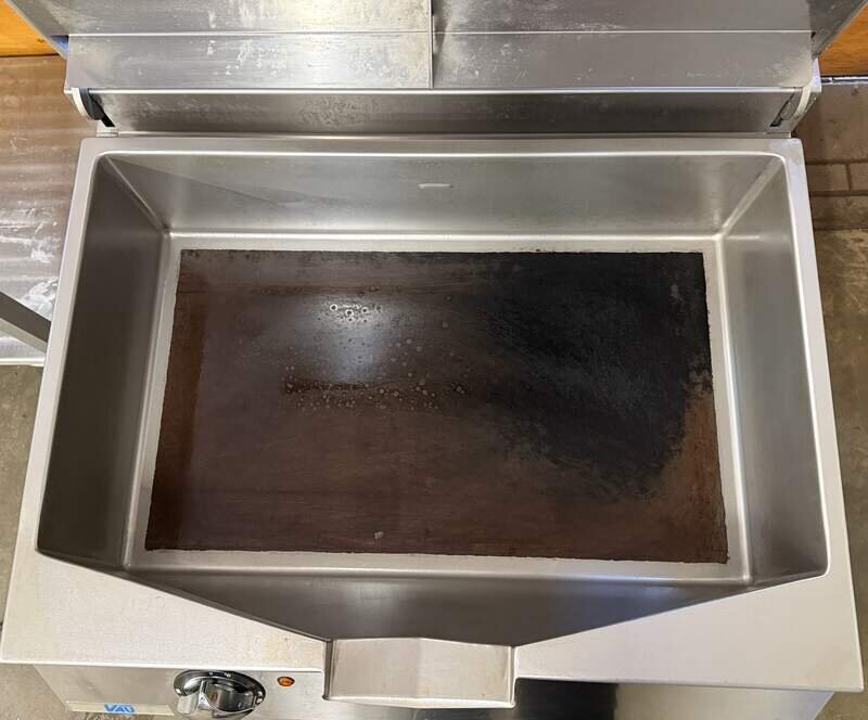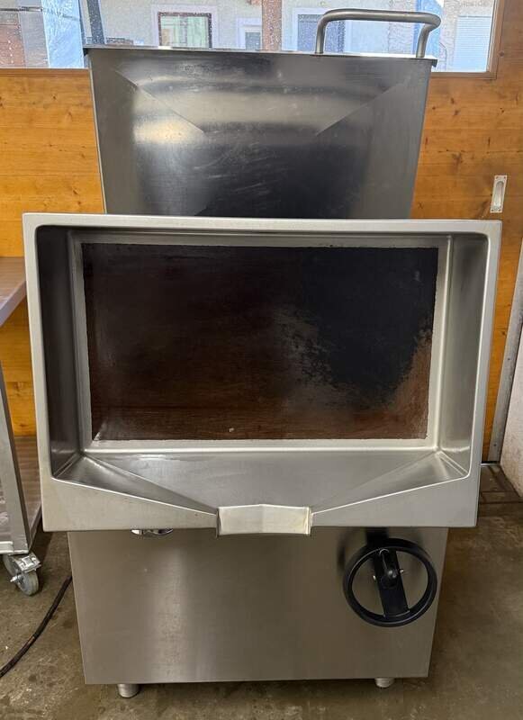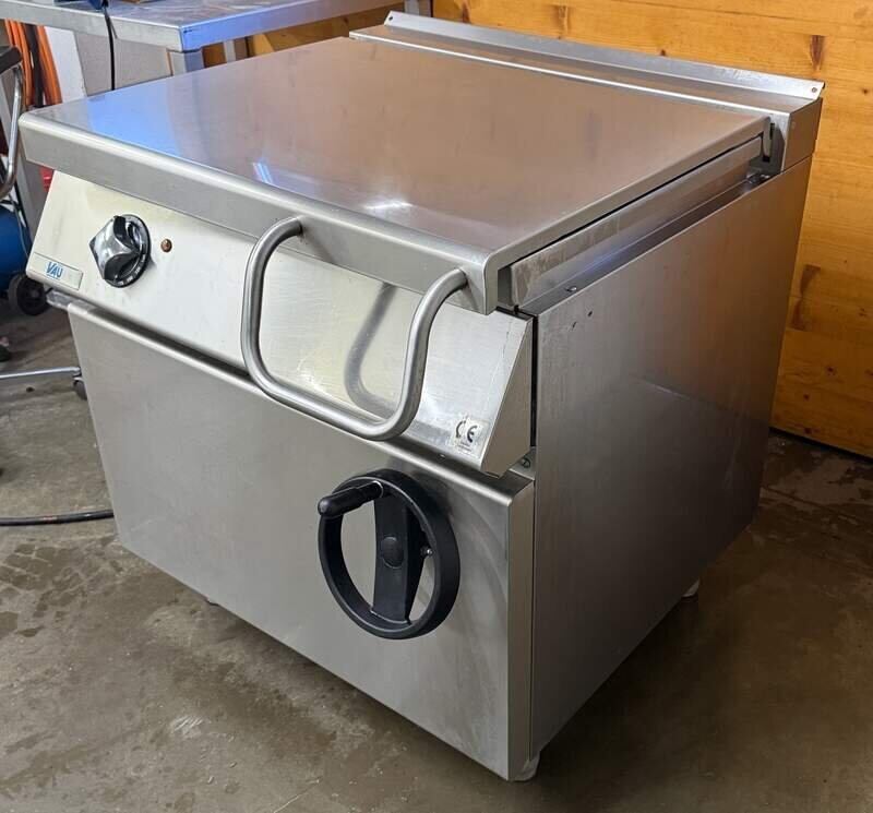 Kippbratpfanne VAU, ca. 60 Liter Inhalt, elektrisch beheizt, Gerät in Edelstahl, Pfannenboden in Guss, Anschluss 400V, Maße Pfanne ca. 73x42x20cm, Gesamtmaße BxTxH ca. 80x85x87cm, Gewicht ca. 115kg, guter Gebrauchtzustand, voll funktionsfähig