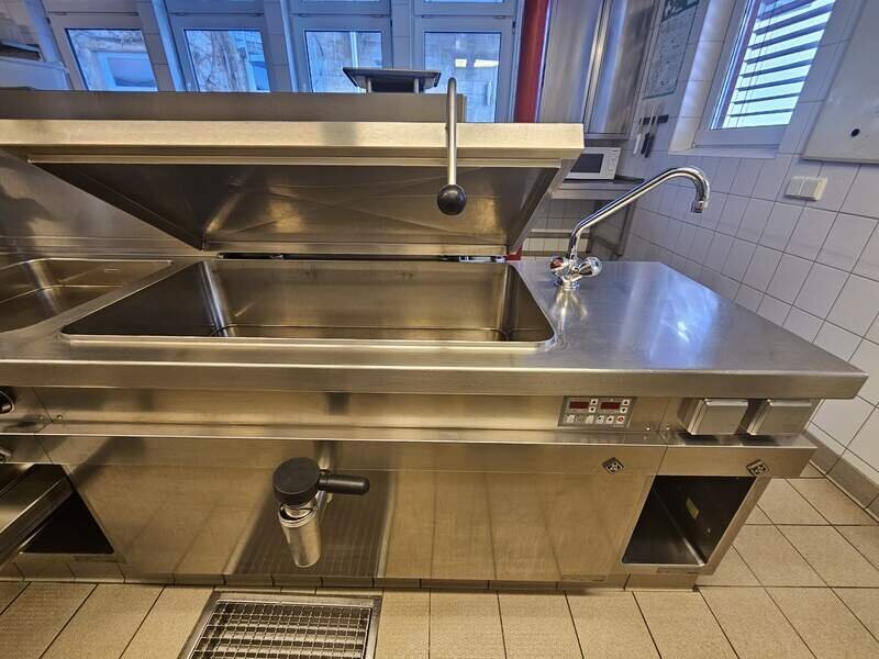 Voll ausgestattete MKN-Kochblockanlage aus CrNi-Stahl in strahlwassergeschützter Ausführung, Einbaujahr 2016, Neupreis: 35.335.- €