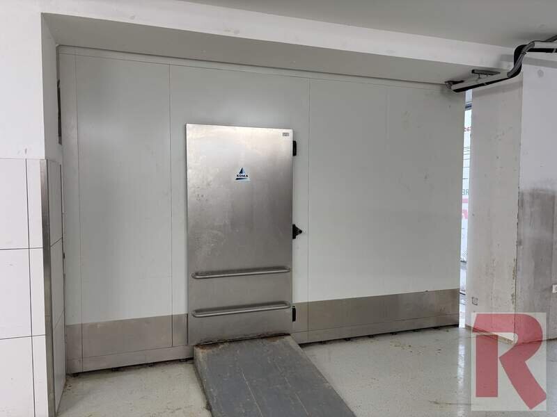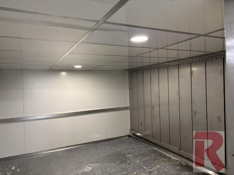 Sufficient space and a large door opening of approx. 190 x 220 cm are available for dismantling the cell. This can be reached at ground level by van / lorry. The compressor is located in the cellar, but can also be brought outside via a ramp; the condenser is mounted on the roof (flat roof). Technical equipment will probably be needed to lift it off the roof.