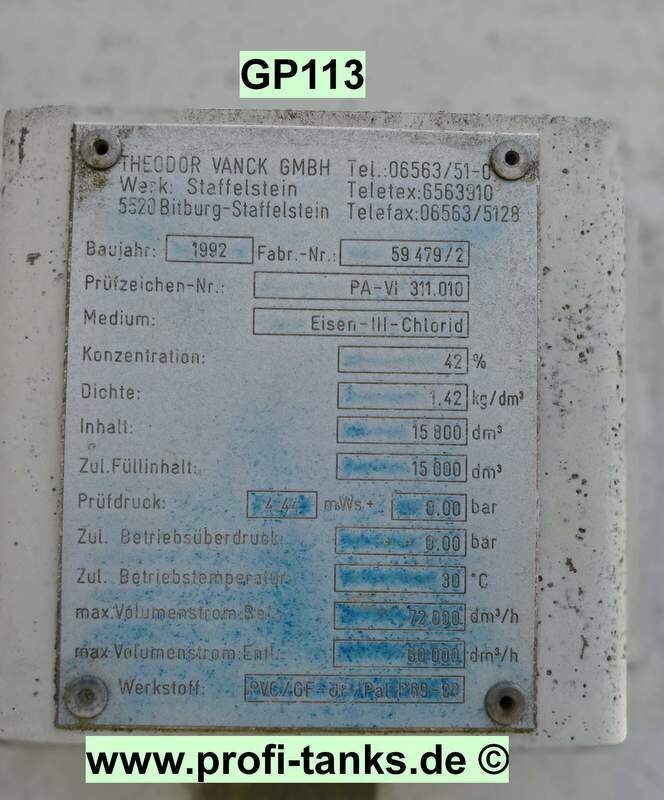 P113 - gebrauchter ca. 15,8 m³ / 15.800 Liter PVC-GF-Tank, stehend, Flachbodentank