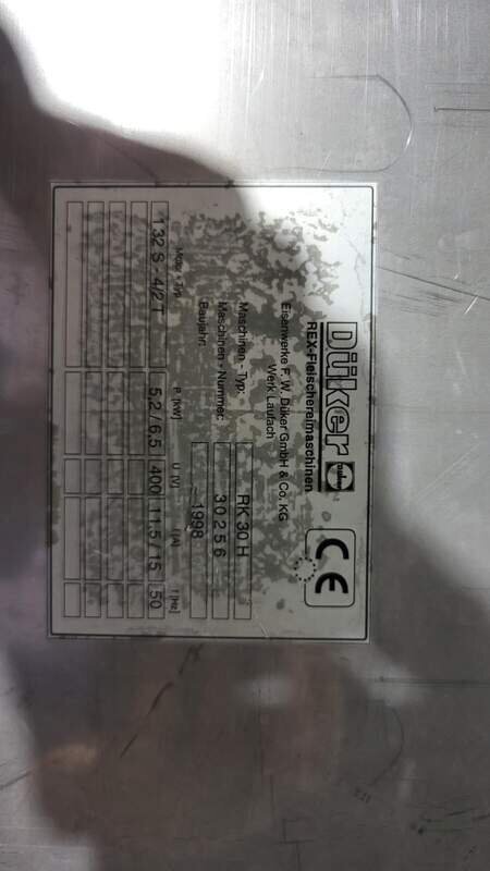 Angeboten wird ein Kutter Wurstkutter Düker Rex RK 30 H, Die Maschine ist voll funktionsfähig sofort einsatzbereit. Technische Daten: 400v, 32A, 5,2/6,5Kw. Messerwelle 2 Gang 1.500 / 3.000 ,Schüssel VA. Der Schneidraum Deckel Besteht aus ALU.