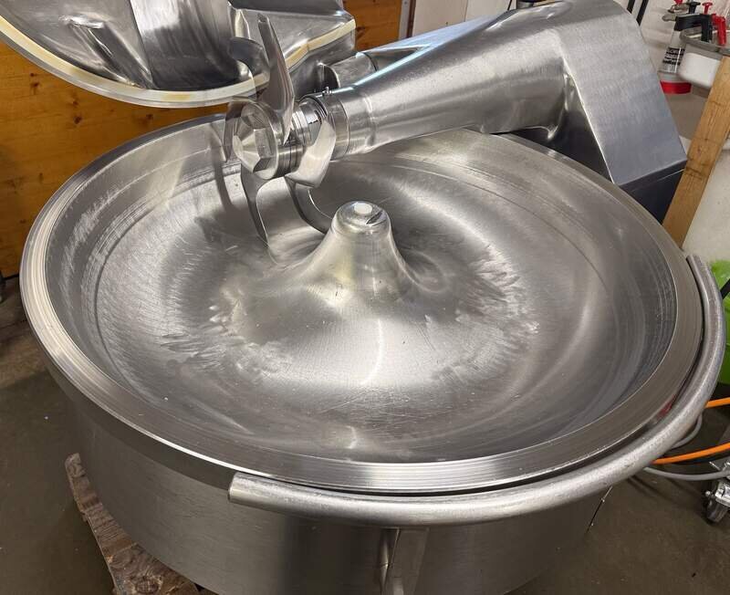 Kutter Seydelmann K60U, 60-Liter Schüssel, Maschine komplett in Edelstahl, 2 Geschwindigkeiten, Mischgänge, mit 6er Messerkopf, Ersatzmesser, Messerkopfschlüssel, Anschluss 400V, 22kW, Maße LxBxH ca. 125x100x128cm, Gewicht ca. 790kg, guter Gebrauchtzustand, voll funktionsfähig