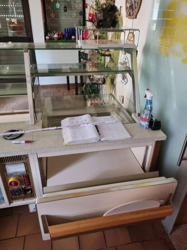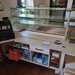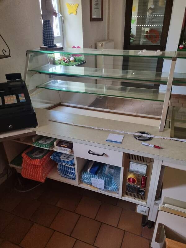 Gebrauchte u. gepflegte Ladeneinrichtung komplett abzugeben. Theke mit Kühlung: Länge: 85 cm, Theke ohne Kühlung: Länge: 140cm, Regal für Brot und Bleche incl. unteres Sideboard 3-türig