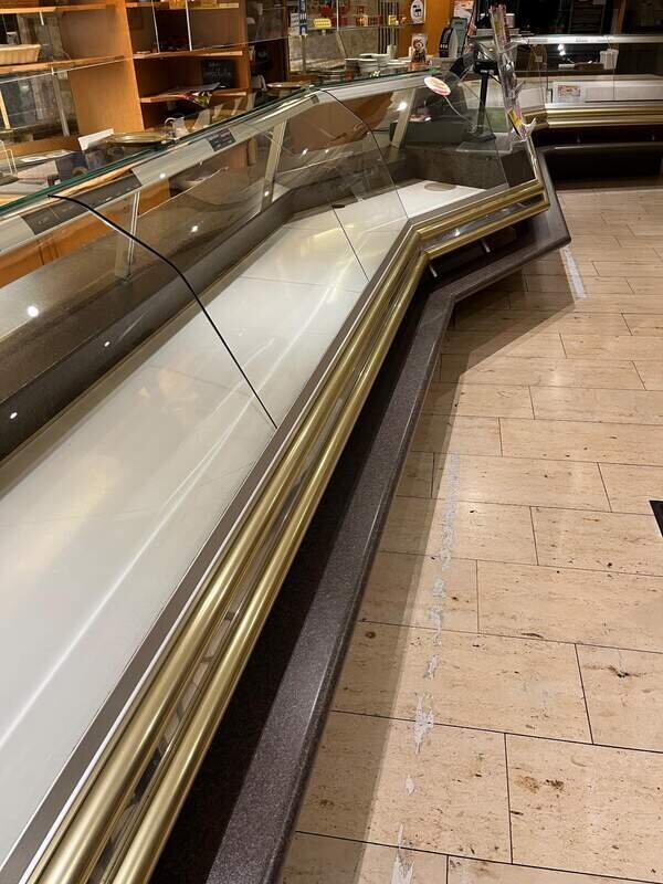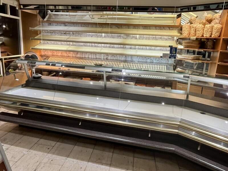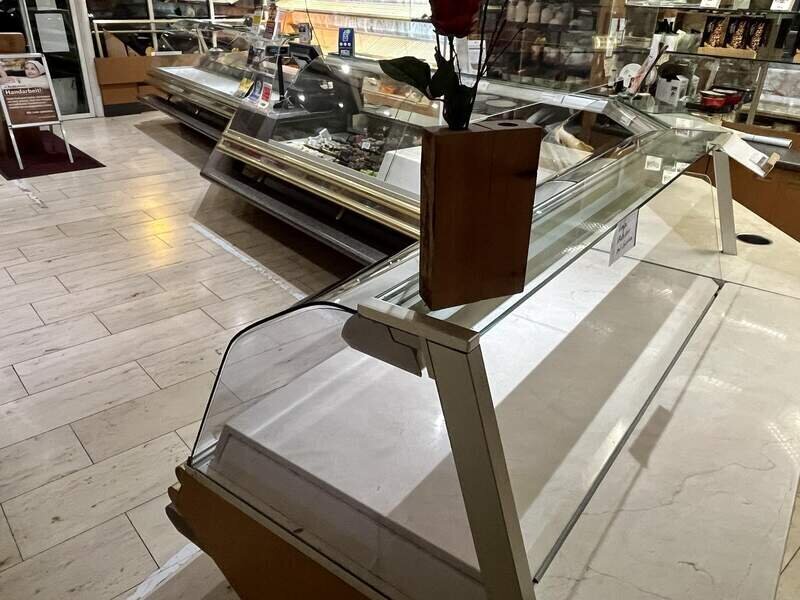Wir bieten aus Geschäftsauflösung eine Bäckerei- / Konditorei-Ladeneinrichtung mit schöner Kuchentheke. Ladentheke, Kühltheke + Regale, Trennscheiben etc.