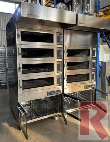 Etagenbackofen MIWE Condo CO 4.0608, BJ 2018 bzw. CO 4.0604, BJ 2016 im sehr guten Zustand, siehe Fotos, mit jeweils 4 Herden je 60 x 80 cm für je ein Blech 58/78 cm bzw. 60 x 40 cm Innenmaß für je 1 Blech 40/60 cm, (jeweils ca. 160 mm Herd-Innenhöhe), MIWE FP Computersteuerung, Steuerung rechts, inkl. fahrbarem Gärraum sowie Ablufthaube mit oder ohne Dampfkondensator. Die Öfen werden geprüft (voll funktionsfähig) und gereingt angeboten.