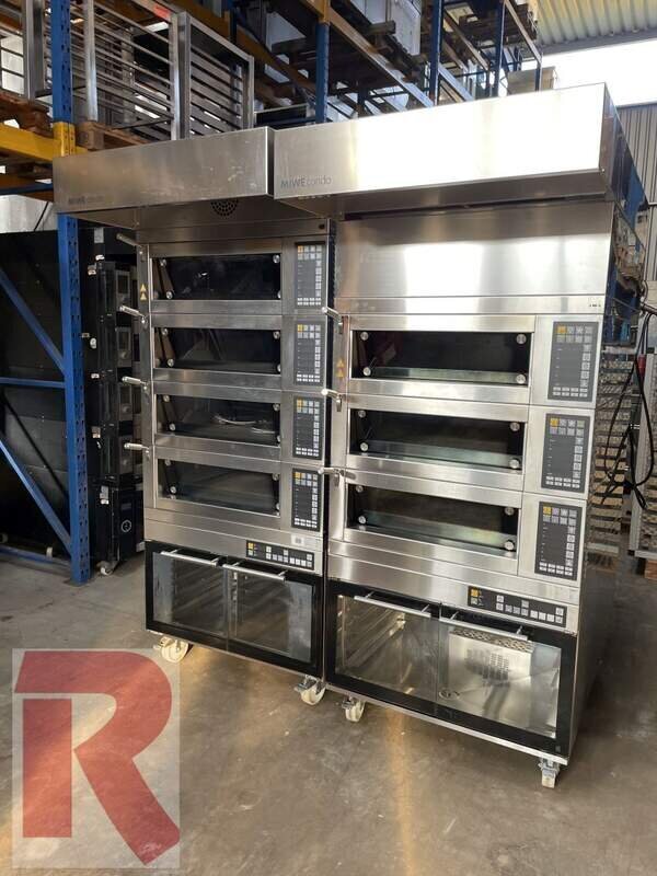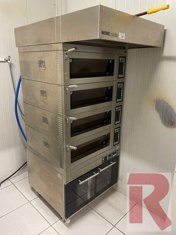 Deck oven MIWE Condo CO 4.0608, year of manufacture 2018 or CO 4.0604, year of manufacture 2016 in very good condition, see photos, with 4 decks each 60 x 80 cm for one tray 58/78 cm or 60 x 40 cm for 1 tray 40/60 cm (each approx. 160 mm oven interior height), MIWE FP computer control, control on the right, incl. mobile proofing chamber and exhaust bonnet with or without steam condenser. The ovens are offered tested (fully functional) and cleaned.