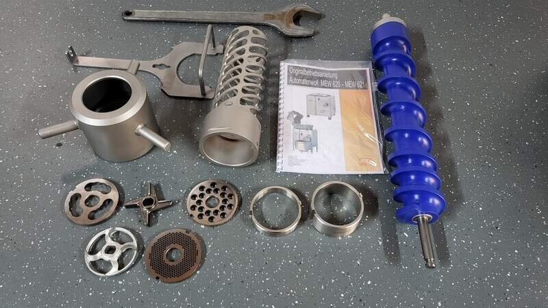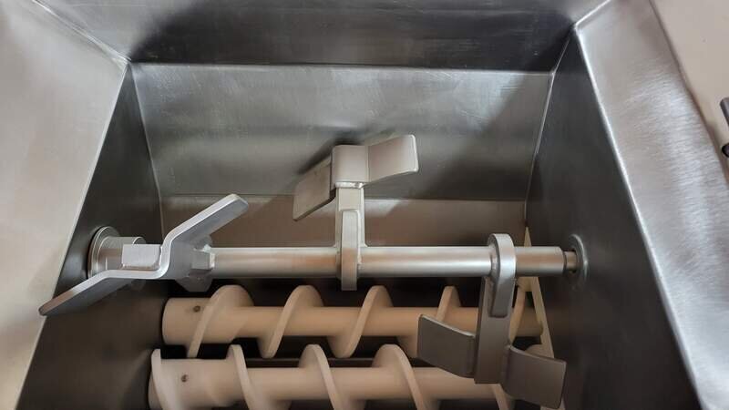 Angeboten wird ein Misch - Winkelwolf vom Hersteller Mado, Typ MEW 621 S Bj. 2023Ü in einem Neuwertigen zustand. Die Maschine läuft auf 400 Volt, 5,5 kW, komplett Edelstahl, Unger System 98 mm Neu, Werksüberholt, sofort einsatzbereit.