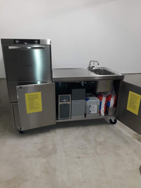 Gläserspülanlage mobil - XL Spülmaschine Colged - Wasserenthärtungsanlage Winterhalter - Umkehrosmoseanlage Winterhalter // Maße_ L 1700 x T 700 // inkl. Anschluss-Schläuche und Kabel // Spülanlage 400 V / 10 kW // Wassererhitzer 230 V 2,3 kW