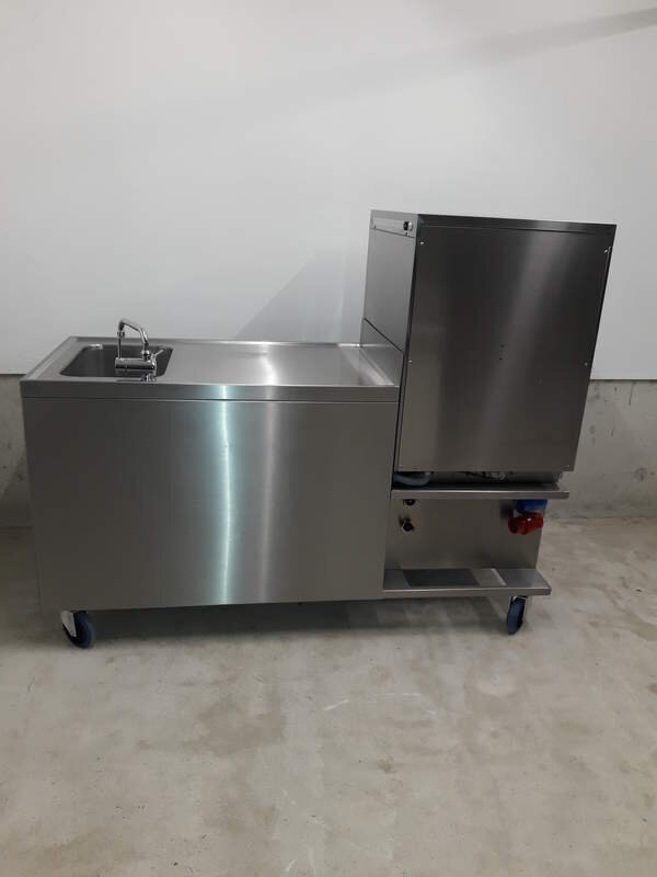 Die mobile Gläserspülanlage wurde zum Spülen von Gläsern in Gläsertransportboxen oder Gläserkörben gebaut. Die Universalspülmaschine kann Körbe bis zu einer Größe von 600 x 500 aufnehmen. die dreiflügelichen Wascharme der Maschine sorgen für bestes Spülergbnis. Im Unterschrank ist eine Kombination von Wasserenthärtungsanlage mit nachgeschalteter Umkehrosmoseanlage verbaut, was für beste Wasserwerte sorgt. Ein Warmwasserbereiter für das Vorspülbecken ist ebenfalls verbaut. Im Unterschrank befinden sich auch saube aufgeräumt die Spülmittelbehälter, der Salzvorrat, Ersatzfilter sowie die Geräteunterlagen. Die Erstinbetriebnahme erfolgt nach Kauf. Die Anlage ist neu und unbenutzt. Das Gerät steht zur Abholung bereit.
