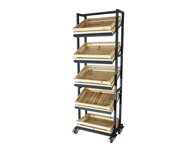 Unser schmales Obst- und Gemüseregal bietet je nach Einheit Platz für bis zu 15 Gemüsekisten, ist fahrbar und mit Bremsen ausgestattet