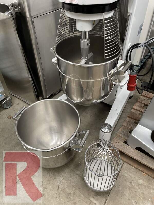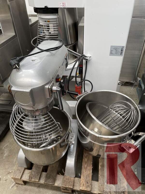 GGM planetary mixer PRME40, year of manufacture 2020, little used, for up to approx. 40 litre bowl, incl. 2 bowls and 2 tools (flat beater and whisk), incl. digital setting of speed and time with automatic switch-off. With protective grille and bowl height adjustment. 380 - 400 V, 1.1 to 1.85 kW. Cleaned and checked.