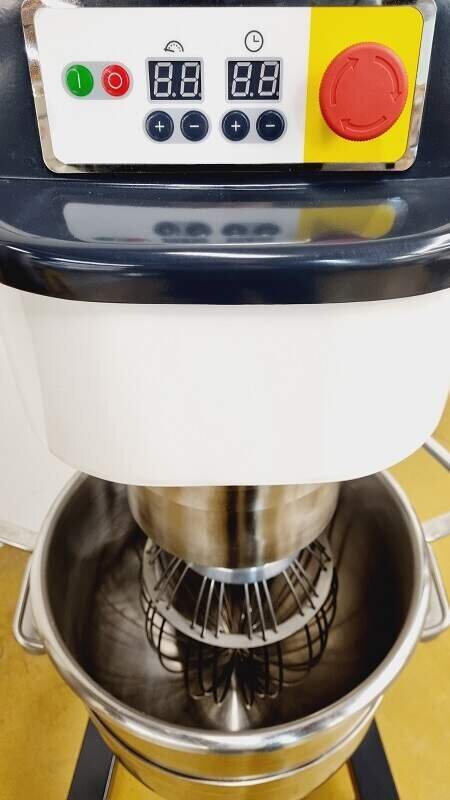 Die Planetenrührmaschine Modell: Planeto PL 40 ist mit LED Steuerung und Zeitschaltuhr sowie 10 Leistungs-Stufen ein 40 Liter Edelstahlkessel 1 Flachrührer 1 Knethaken und 1 Rührbesen sind Serienausstattung